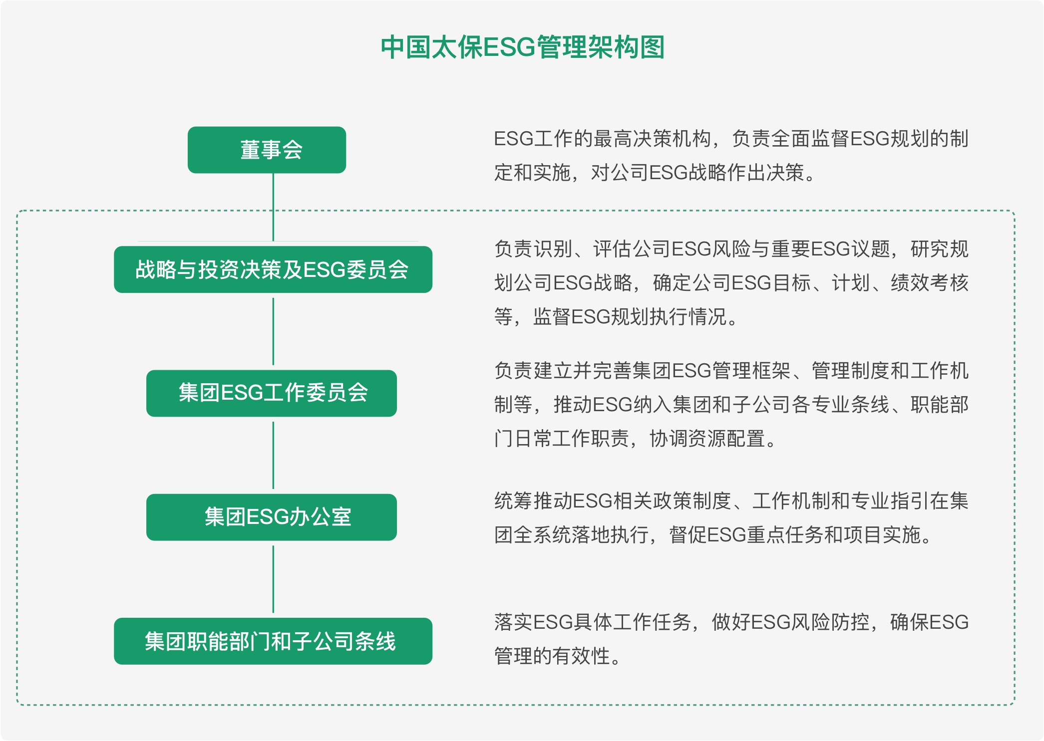 中國太保建立了層次分明、分工明確的“董事會-管理層-執(zhí)行層”的完整ESG治理架構(gòu),為集團自上而下履行ESG實踐提供了良好的管理基礎(chǔ)和組織保障。中國太保董事會執(zhí)行董事和管理層的績效薪酬與ESG指標表現(xiàn)相掛鉤。