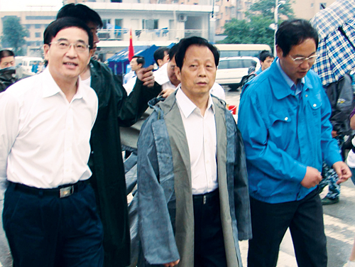 2008年5月29日,中國保監(jiān)會主席吳定富(左二),在太保壽險董事長金文洪(左一)陪同 下,視察了太保客戶——德陽東方汽輪廠災(zāi)情,吳定富勉勵太保繼續(xù)做好抗震救災(zāi)理賠服務(wù)工作。