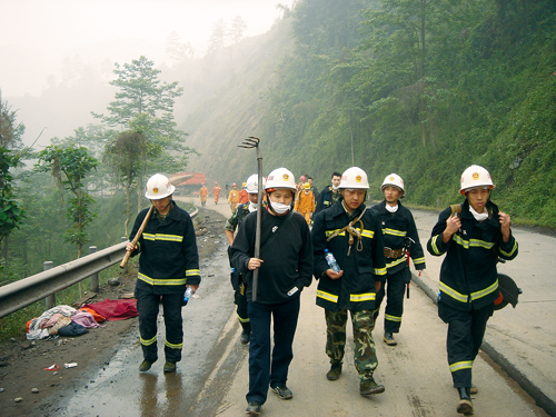圖為產(chǎn)險重慶分公司梁馳(前排戴口罩者)等自愿前往什邡紅白鎮(zhèn)災(zāi)區(qū),與人民子弟兵一起搶險救災(zāi)。
