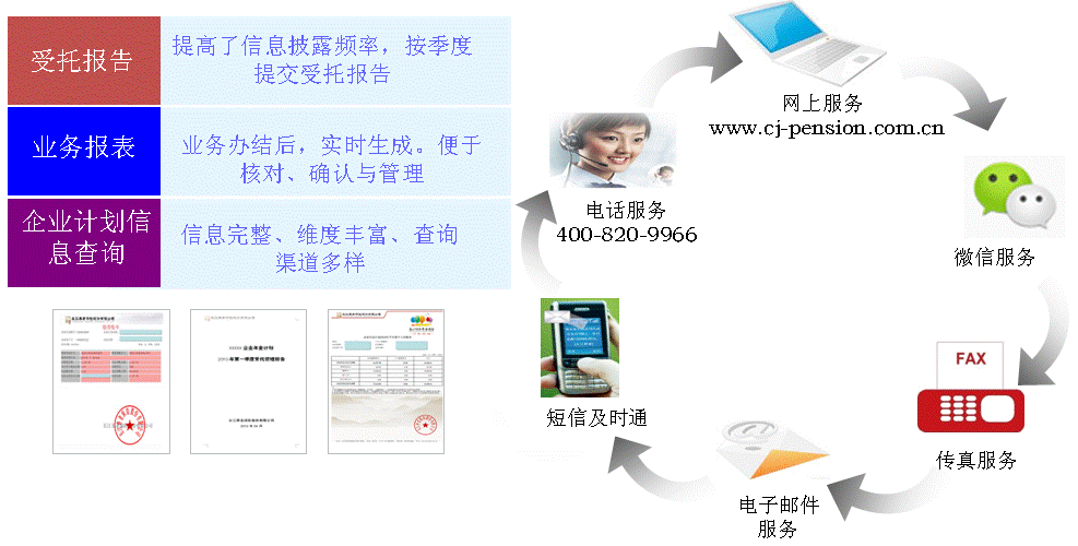 為保證客戶及時(shí)了解計(jì)劃運(yùn)作情況,長江養(yǎng)老利用網(wǎng)上、電話、短信、電子郵件、微信等多種現(xiàn)代化的通訊方式提供全方位的查詢披露服務(wù),并能根據(jù)客戶需要量身提供個(gè)性化報(bào)表服務(wù)。企業(yè)還可自助定制短信及郵件信息種類,長江養(yǎng)老提供包括業(yè)務(wù)辦理結(jié)果提醒、服務(wù)信息通知、問題件提醒等在內(nèi)的短信及郵件服務(wù)。